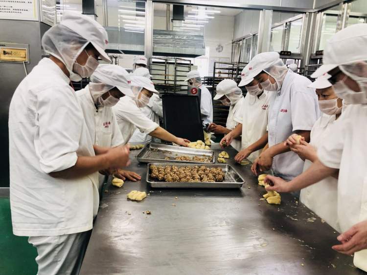 月饼外皮要酥软,但也不能太软;素斋月饼内陷要甜香,但也不能太甜……在如今这个高度机器流程化的时代里,龙华素斋月饼依然传承着手工工艺,或许就因为这份不能多一分、也不能少一分的好吃口感!在干净的国际标准化工厂间里,师傅们每天都需要不断重复着原料加工、 和面制馅、制皮包酥、推皮下剂、包饼成型、置盘烘烤、冷却包装……每道手工环节看似简单,但没个三、四年的功夫根本无法达到制作月饼的标准。