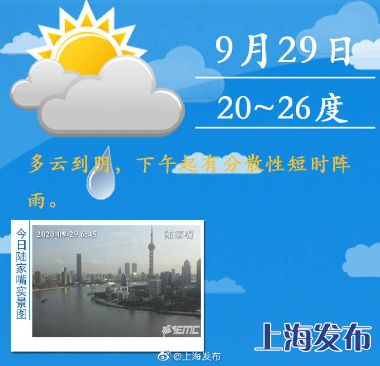 今天多云到阴,下午起有分散性短时阵雨,最低温度20度,最高温度26度,东北风3-4级。30日之前基本都以多云或阴为主,白天有分散性短时阵雨出没。10月1-2日两天天空状况较好,气温适宜,3日后期到4日有一次明显的降水过程,同时伴有降温,最低气温跌破20度。提醒大家及时关注天气资讯,合理安排生活及出行。
