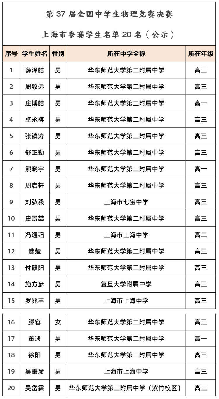 上海市参加第37届全国中学生物理竞赛决赛的20名学生名单,已经在上海市物理学会网站公示。20人名单中华东师大二附中一所学校独占15名。