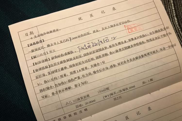 陈女士的就医记录显示:“患者被狗咬伤,下肢开放性伤口长约7厘米,深度1厘米,共缝合7针,及在大腿多处咬伤。伤口损伤严重,缝合后出血、感染、延迟愈合及皮瓣皮肤坏死可能大。”