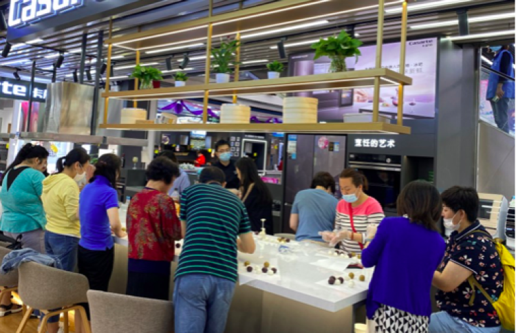 中秋佳节即将来临,一家团圆之际当然少不了月饼啦!买的月饼不放心,不如学会做给家人吃,既有仪式感,又不缺满满的心意!在上海国美浦建家电体验中心,消费者在烘焙师的带领下正在制作自己的中秋月饼作品。现场家庭分工合作,和粉、糅团、分块、包馅、模具压饼,每道工序都做得有板有眼,大家捧着一个个亲手制作的冰皮月饼,脸上都挂满幸福的笑容。