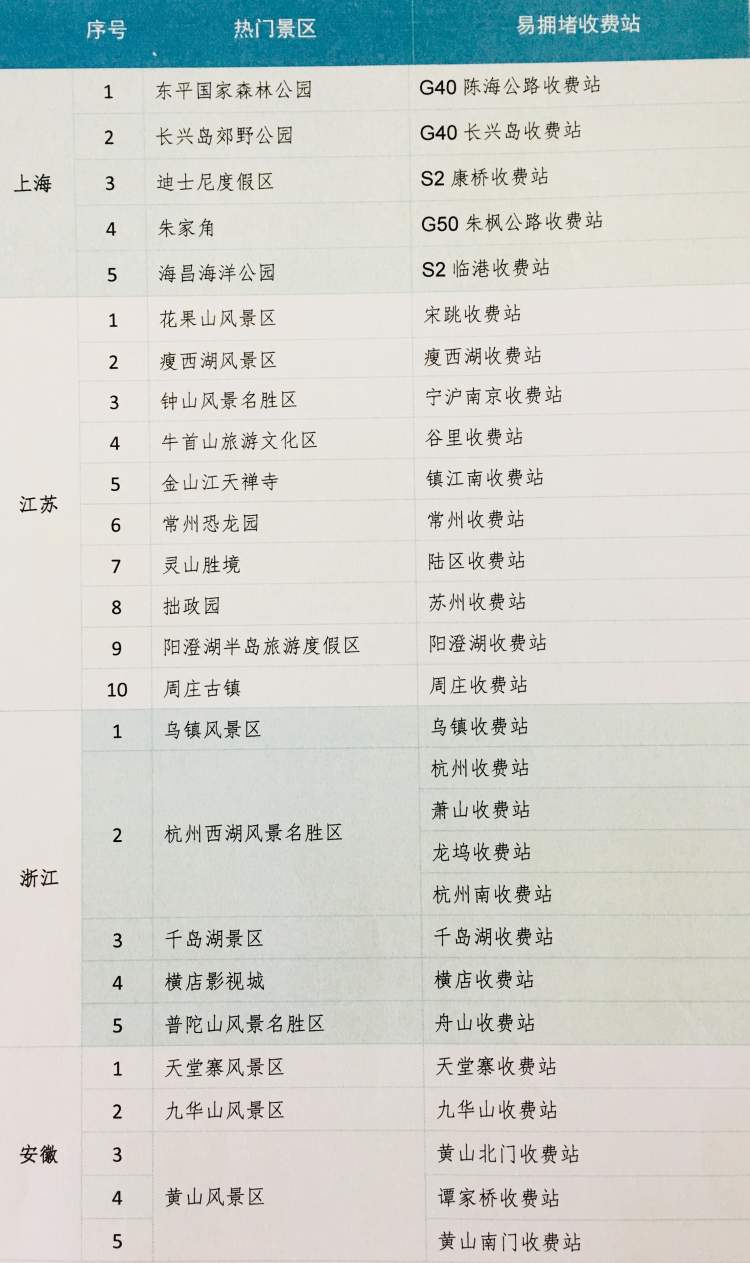 节假日期间,景区周边关联收费站将在高峰时段出现方向性车流缓行甚至拥堵的情况,长三角地区与热门景点相关联、易拥堵的收费站近30个,包括上海迪士尼度假区、江苏瘦西湖风景区、杭州西湖风景区、安徽黄山风景区等著名景点的周边收费站。