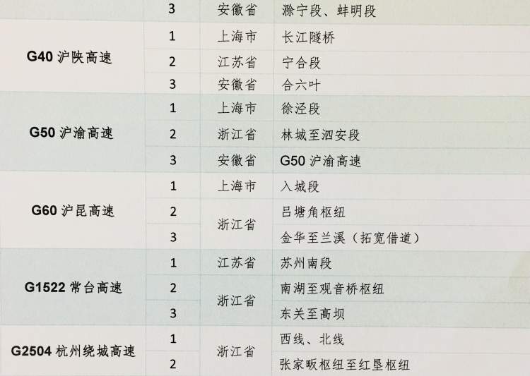 从长三角范围来看,假日期间易拥堵的通道包括:G2京沪高速、G15沈海高速、G40沪陕高速、G50沪渝高速、G60沪昆高速等,出行指南对通道在各省市沿线的较拥堵路段都作了详尽的梳理。