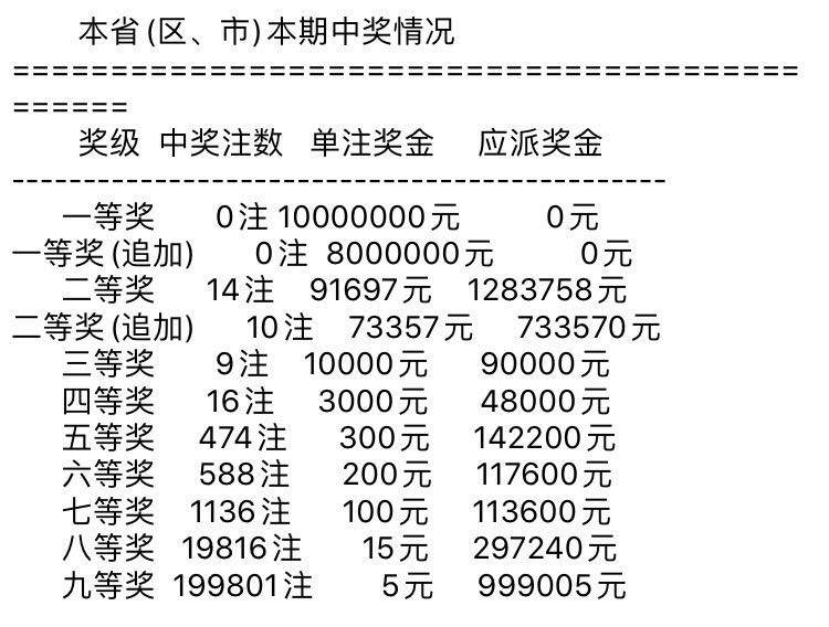 本期二等奖全国开出113注,单注奖金为9.16万元;其中57注采用追加投注,每注多得奖金7.33万元。追加后,二等奖单注总奖金为16.5万元。