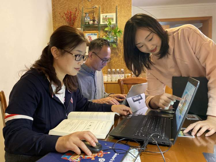 他们派出最年轻的贾臻率先去“学艺”,然后三人在微信群里研究哪个平台适合操作、网卡了怎么办、课讲了一半不能分享屏幕了怎么办……每天晚饭后,老骥们开始切磋网课技艺,每晚语数英三门课轮着模拟。