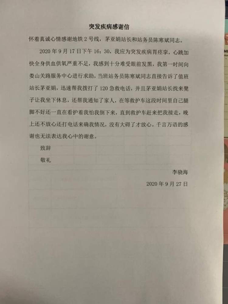 明天就是国庆节了,地铁2号线各车站都在为迎接国庆、中秋双节而忙碌着。今天,2号线娄山关路站收到一位乘客寄来的一箱水果和一封表扬信,并且还表示,他想找到在车站救助过他的茅亚娟站长。