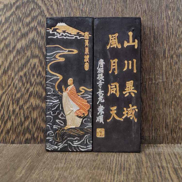 “鉴真东渡”墨锭更令人眼前一亮。一句“山川异域风月同天”,唤起了多少在风雨中携手同行的记忆。不过,它不是今年新推出的产品,而是1980年唐朝高僧“鉴真坐像”从日本回国巡展时,曹素功为纪念这一盛典,增加两国人民友谊而创制的纪念墨。