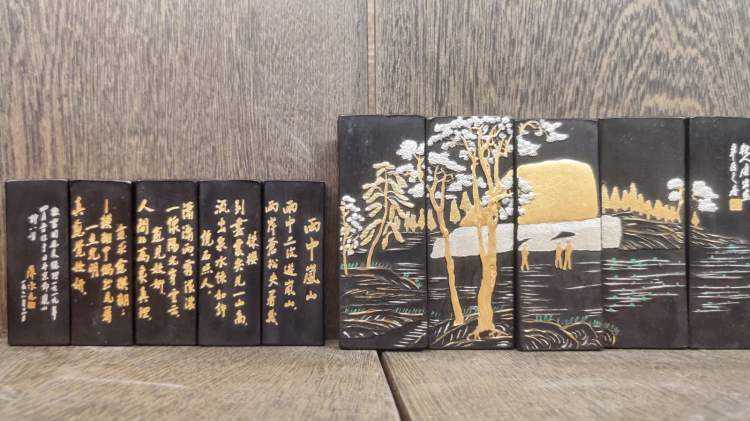 可能每个人的童年都有一支的英雄钢笔,一罐曹素功的墨汁。让周到君没有想到的是,墨锭也可以是舍不得用的艺术品。“西中岚山”墨锭一组五块,一面是诗文,一面是画作,摆在那儿就是充满现代高级感的黑金书画。