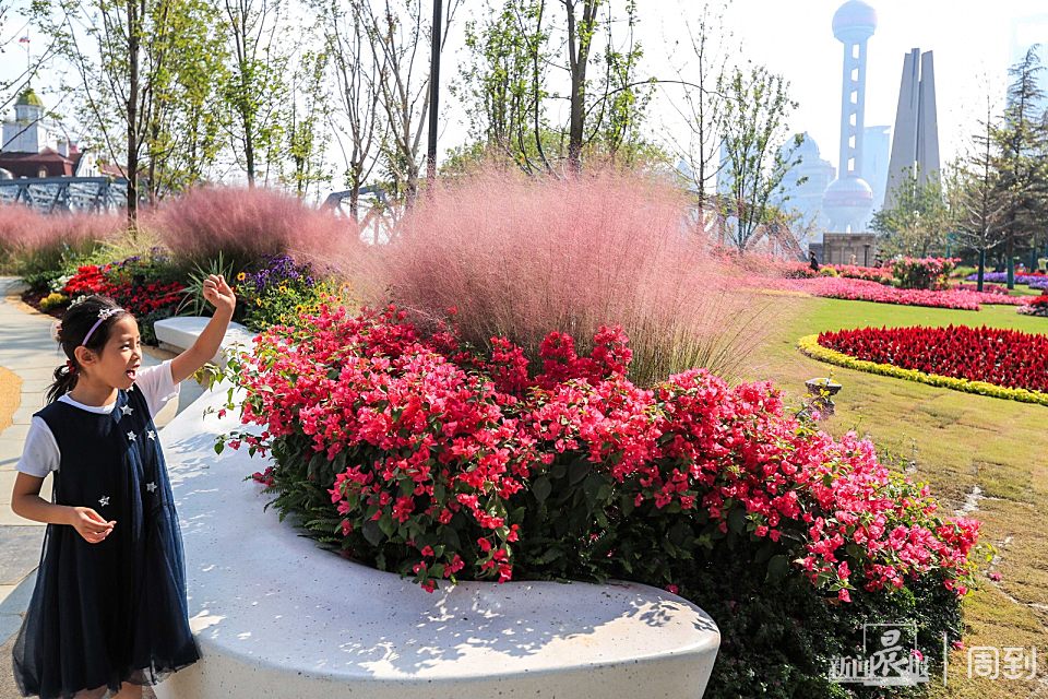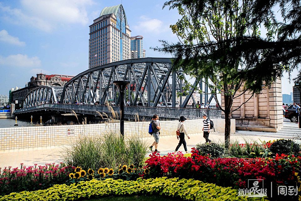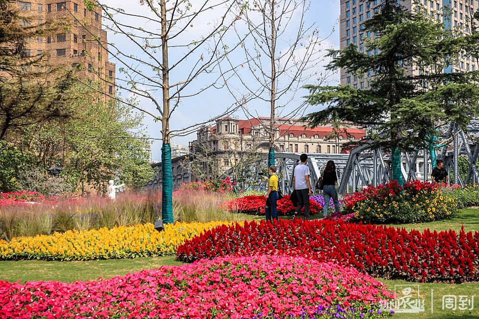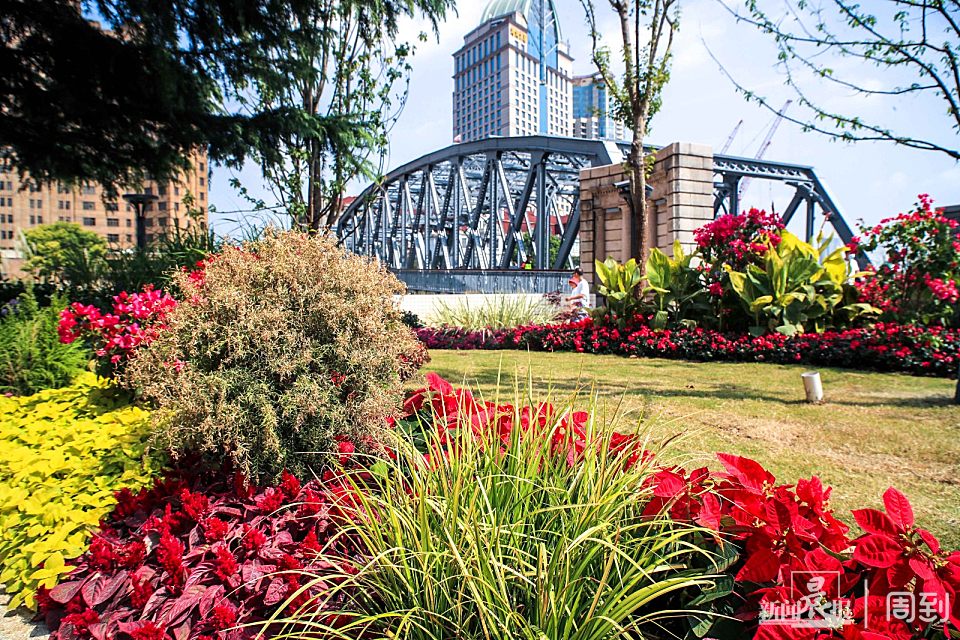 紧挨着外白渡桥的这片景观绿带,绿树、百花、观景台等组成了一副错落有致而又生机盎然的美丽画卷。