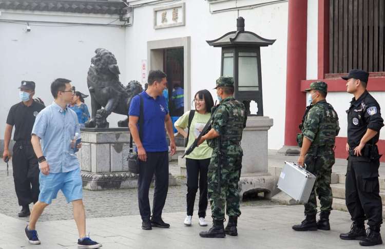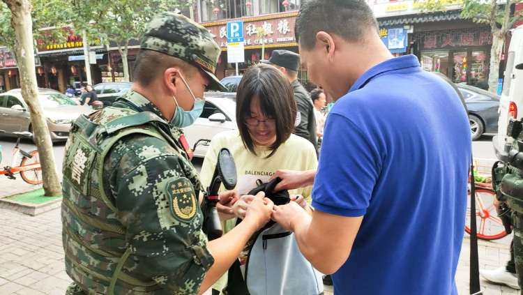 国庆节下午,正在嘉定南翔老街执勤的武警上海总队执勤第五支队哨兵孟俊奇在巡逻途中偶遇父亲和妹妹,经过简单的寒暄,向他们敬了一个标准的军礼后,继续加强巡逻防控。
