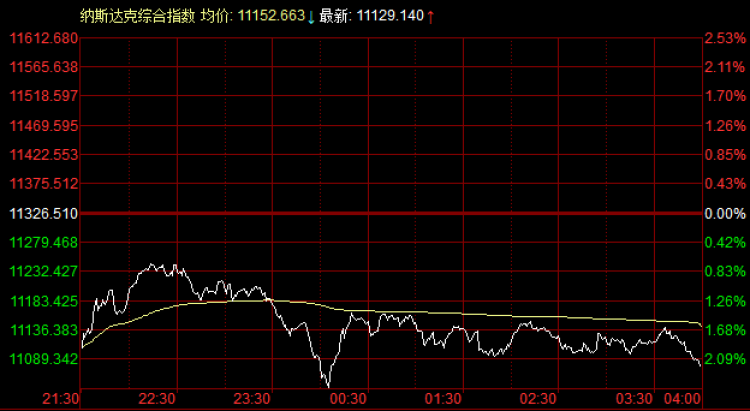 来看隔夜美股收盘的具体数据,至收盘,道琼斯工业平均指数下跌134.09点,跌幅0.48%,收报27683点;纳斯达克综合指数下跌251.49点,跌幅2.22%,收报11075点;标普500指数下跌32.36点,跌幅0.96%,收报3348点。