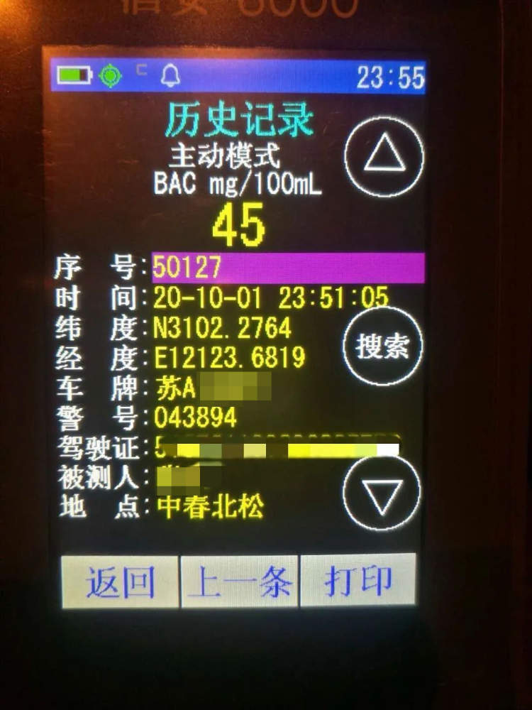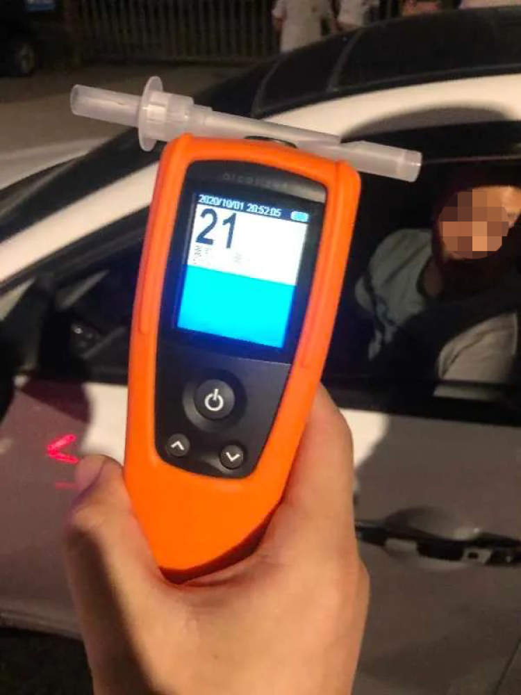10月1日零时40分,嘉定公安民警在民乐路出沪宜公路西约100米,对驾驶临时号牌为沪RUXXXX机动车的驾驶人陈某某进行呼气酒精测试,为124mg/100ml,涉嫌醉酒驾驶机动车。目前,案件在进一步办理中。