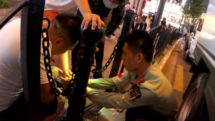 10月1日晚上8时,南京东路河南中路路口绿灯亮起时,武警官兵把“人墙”打开,孙先生年幼的孩子不小心摔倒在地,小腿受伤出血。