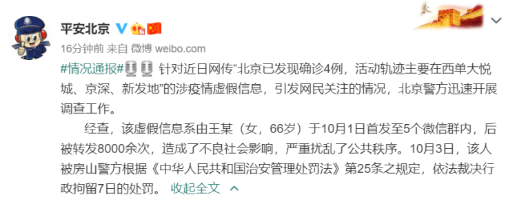 制造传播北京疫情谣言,66岁女子被行政拘留7日 周到君 2020-10-04 来源:周到上海 据北京市公安局微博“平安北京”,针对近日网传“北京已发现确诊4例,活动轨迹主要在西单大悦城、京深、新发地”的涉疫情虚假信息,引发网民关注的情况,北京警方迅速开展调查工作。 经查,该虚假信息系由王某(女,66岁)于10月1日首发至5个微信群内,后被转发8000余次,造成了不良社会影响,严重扰乱了公共秩序。10月3日,该人被房山警方根据《中华人民共和国治安管理处罚法》第25条之规定,依法裁决行政拘留7日的处罚。 来源:周到上海 作者:周到君 赞一个 (0)