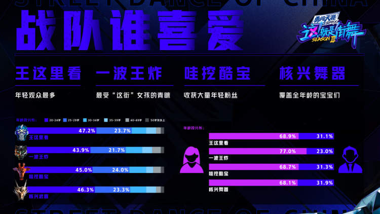 四大战队中,王嘉尔的“王这里看”年轻观众最多,王一博的“一波王炸”最受“这街女孩”青睐,钟汉良的“哇挖酷宝”收获了大量年轻粉丝,张艺兴的“核兴舞器”则覆盖全年龄的观众。