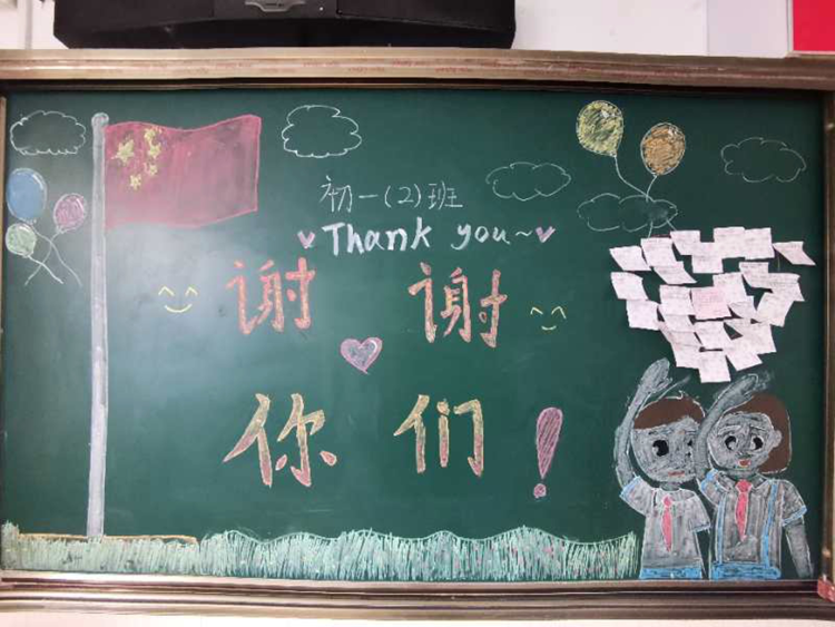 ▲金陵中学学生在黑板上给执勤武警留言致敬