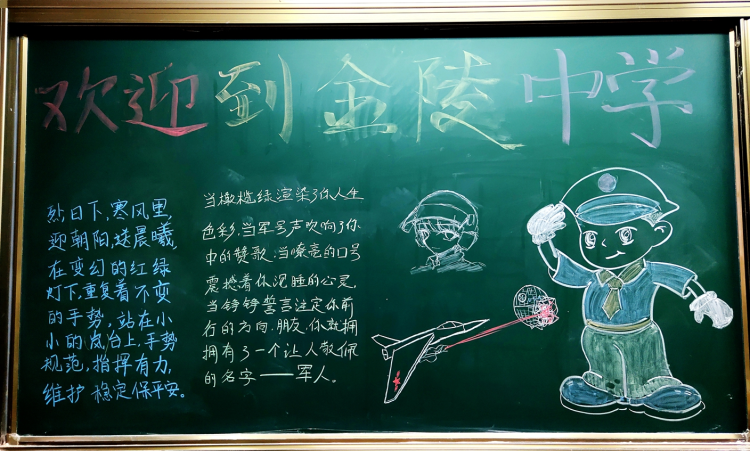 9月30日,当机动第一支队武警官兵列队进入教室休息时,却被眼前的一幕暖到了。不仅教室被打扫得干干净净,每个班级的黑板上,都绘画着欢迎武警官兵的黑板报。