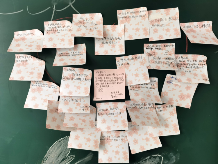 初一(2)班的孩子们还留下纸条贴在黑板上,写下了自己对武警官兵的感谢,拼出了爱心的形状。