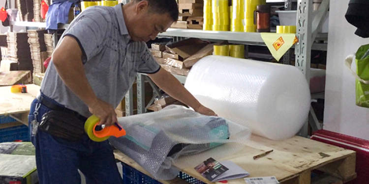 在流水线上,一袋20公斤重的狗粮,在一位打包师傅的手中“耍得”游刃有余——熟练地裹上3层气泡膜,用美工刀将气泡膜划断,接着把狗粮塞进厚厚的纸箱,在纸箱的各个方位缠上十多圈胶带,最后把一个塑料开箱器粘在纸箱上,方便顾客拆开包裹。