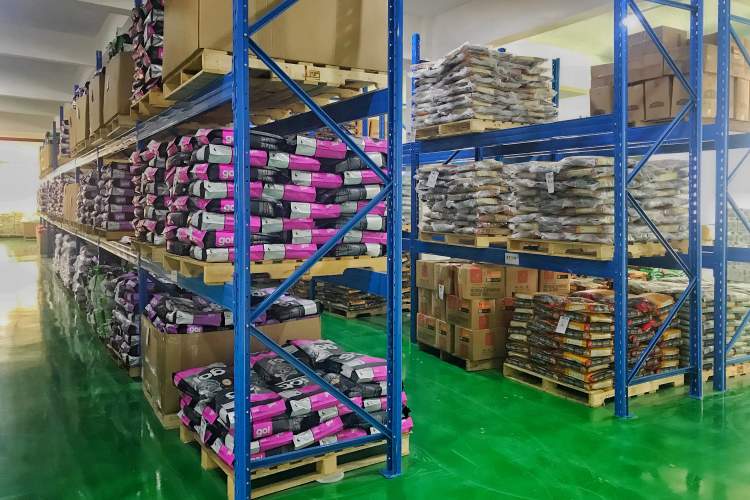 3层高的钢架排列成数排,一袋袋猫粮狗粮整齐地摆放在钢架上。一眼望去,有种“小型宜家”的既视感,仓库里隐约还能听到干燥机发出的嗡嗡响声,即使当天下着小雨,仓库仍旧显得清爽整洁。