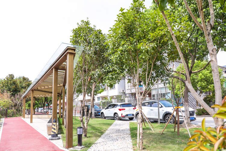 一座崭新的玻璃顶休闲长廊被绿树掩映着,长廊前的休闲坪全部铺设了渗水砖;坐在座椅上望去,面前是缓缓流淌着的亭子泾河,不时有水鸟掠过;300米长的健身步道蜿蜒其中,鹅卵石排成的小路与两旁的绿草坪装点着脚下的一方风景,两处健身器材也已安装完毕。就在几个月前,这里还是一片不可进入式绿地,而在更早以前,这里曾经是小区居民们的“菜园子”。