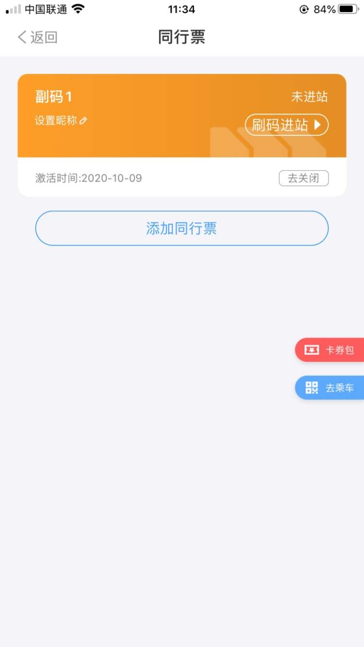 同行票副码激活后支持关闭。关闭的前提条件是该副码未在行程中,若该副码处于已进站未出站的状态,则该副码不支持关闭。