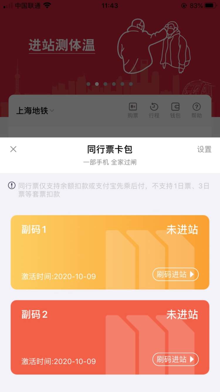 目前,同行票暂支持1个主码激活2个副码,1部手机最多支持3人刷码过闸。