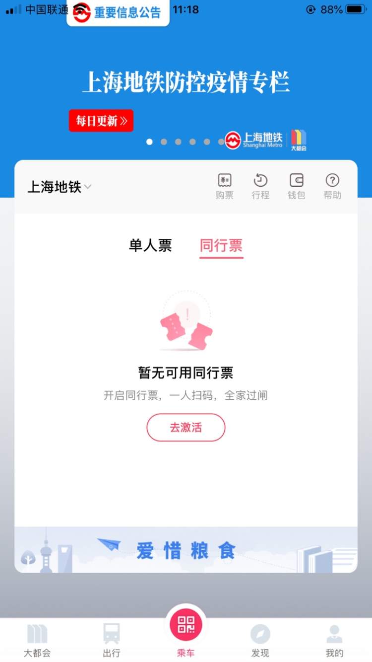 1、进入乘车页,将二维码切换由“单人票”切换为“同行票”。