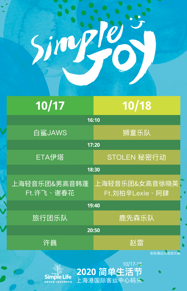 围绕今年“Simple Joy(简单的快乐)”这一活动主题,本届简单生活节将汇聚许巍、赵雷、旅行团乐队、鹿先森乐队等音乐人,许飞、谢春花、刘柏辛Lexie、阿肆四位唱作女声将与上海轻音乐团进行跨界合作,更有多组“宝藏”乐队登场。
