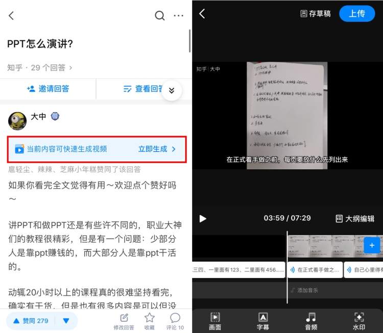 视频制作完毕后,工具直接将成品上传至知乎app。使用该工具,“视频小白”级别的用户也能轻易制作出接近专业级别的视频。
