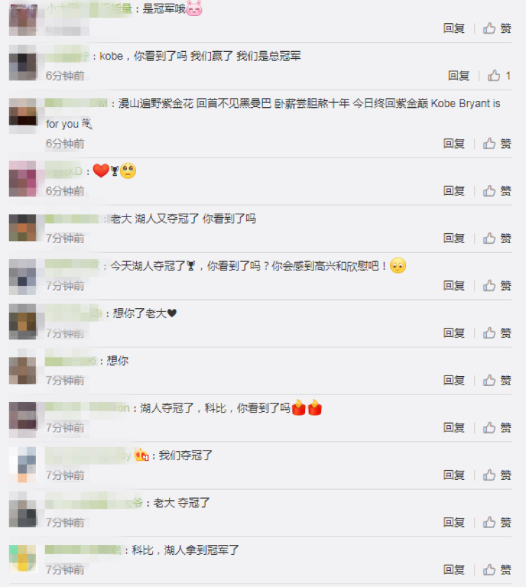 湖人夺冠之后,无数湖人球迷纷纷跑到已故湖人巨星科比·布莱恩特的微博下留言表达喜悦的同时也寄托对科比的怀念。