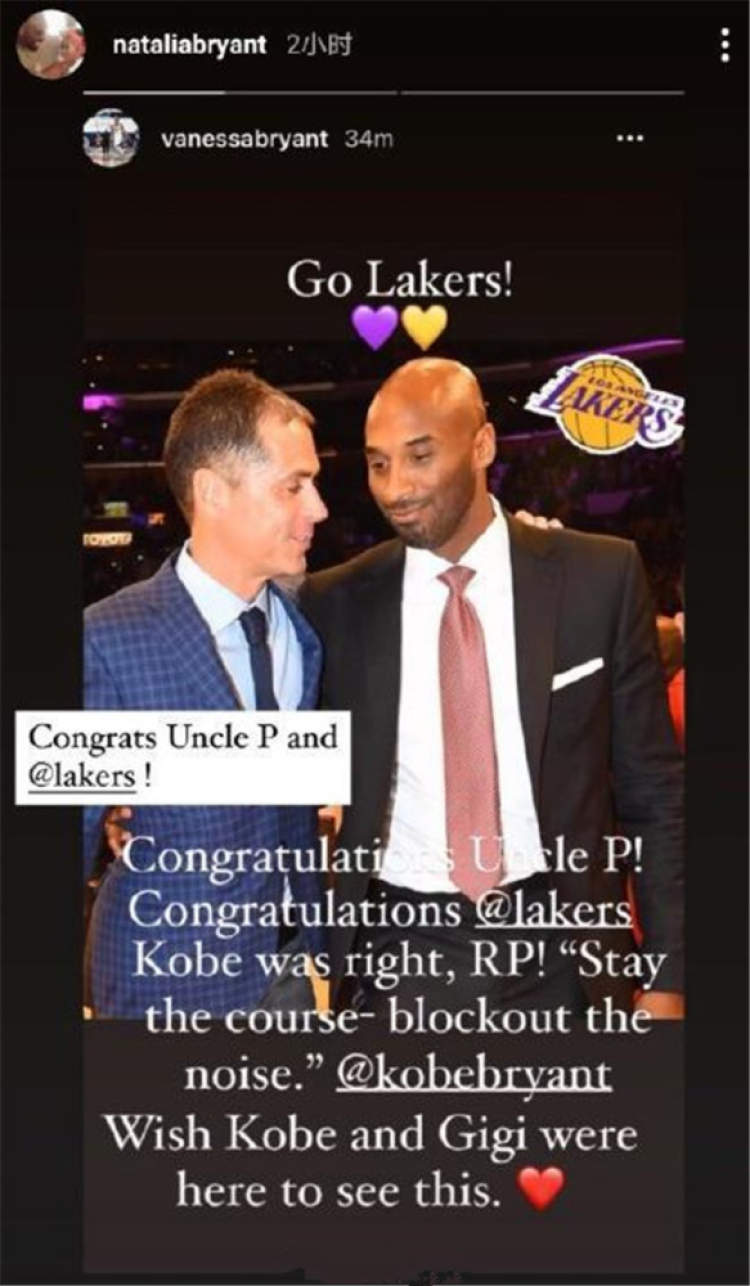 科比的妻子瓦妮莎也在赛后更新社交媒体,庆祝湖人夺冠。她写道:“祝贺佩林卡叔叔!祝贺湖人。科比是对的!保持专注,屏蔽杂音。真希望科比和吉安娜也能亲眼目睹这一幕。 ”