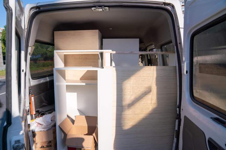 不久,一辆白色小型专用客车被民警拦下,车内后排座椅被全部拆除,整个空间满满摆放了各类柜子。