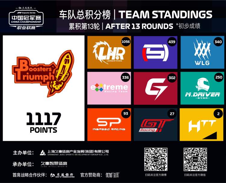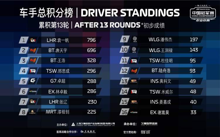 10月11日下午14:10,F1电竞中国冠军赛职业联赛第13轮,BT车手唐天宇运气拉满连赢两场,车手积分净增76分,不过目前距离车手积分榜领跑的LHR车手袁一帆还有100分。而继上一轮LHR车队在法国站拿下1-2完赛后,本轮BT车队也在双倍积分的荷兰赞德沃特赛道拿到了1-2完赛,车队积分榜以1117分继续领跑。