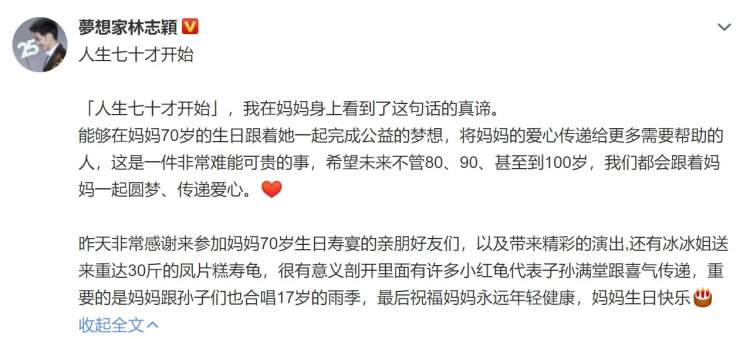 10月12日,林志颖在社交平台写:“人生七十才开始,我在妈妈身上看到了这句话的真谛。能够在妈妈70岁的生日跟着她一起完成公益的梦想,将妈妈的爱心传递给更多需要帮助的人,这是一件非常难能可贵的事,希望未来不管80、90、甚至到100岁,我们都会跟着妈妈一起圆梦、传递爱心。昨天非常感谢来参加妈妈70岁生日寿宴的亲朋好友们,以及带来精彩的演出,还有冰冰姐送来重达30斤的凤片糕寿龟,很有意义剖开里面有许多小红龟代表子孙满堂跟喜气传递,重要的是妈妈跟孙子们也合唱《17岁的雨季》,最后祝福妈妈永远年轻健康,妈妈生日快乐。”