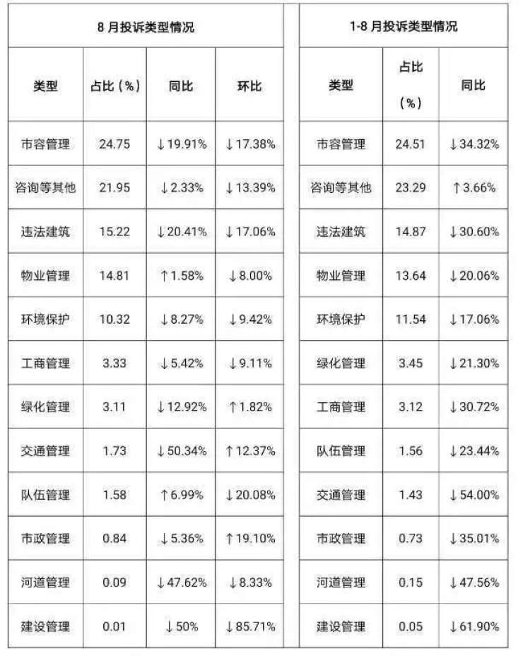 今年1月至8月,从市民诉求大类来看,市容管理、违法建筑、物业管理等居于前列:
