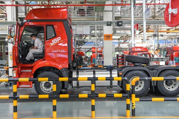 9月1日,在位于长春的一汽解放总装车间,工人在装配车辆。(新华社)