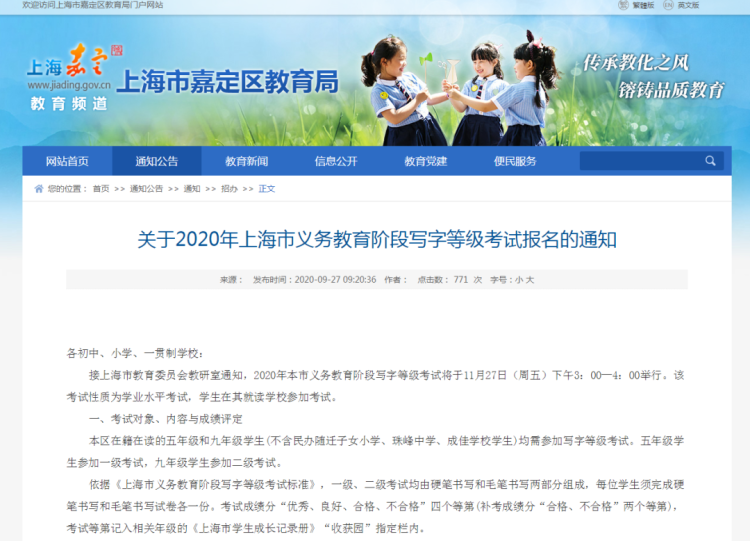 2020年本市义务教育阶段写字等级考试性质为学业水平考试,因此,对每个学生来说非常重要。