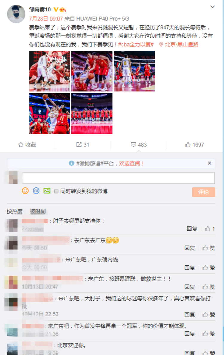 不少球迷在八一男篮中锋邹雨宸社交媒体下留言招募