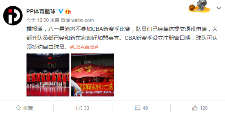 北京时间10月14日,距离新赛季CBA联赛开幕仅剩3天,而据国内媒体PP体育消息,八一男篮将不参加CBA新赛季比赛,队员们已经集体提交退役申请,CBA新赛季设立注册窗口期,球队可认领签约自由球员。