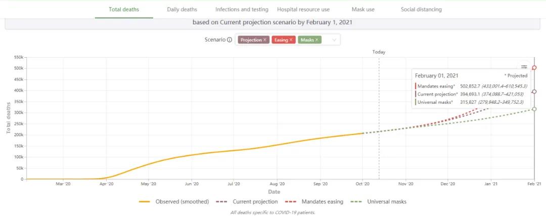△美国华盛顿大学卫生统计评估研究所预测,如放松管控措施,到2021年2月1日,美国累计新冠死亡病例将超过36万例 (图片来源:华盛顿大学卫生统计评估研究所官网截图)