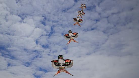 对于运动风筝等现代风筝,李郁仙介绍,要看风筝的放飞效果和舞蹈编排。“大家知道水上芭蕾、冰上芭蕾,我们放风筝也有风筝芭蕾。看风筝的节奏感、与音乐的配合、多线操作的配合。”