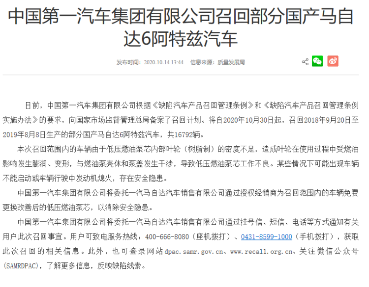 今天,国家市场监督管理总局发布消息,中国第一汽车集团有限公司将自2020年10月30日起召回共计16792辆汽车。其中,召回2018年9月20日至2019年8月8日生产的部分国产马自达6阿特兹汽车,共16792辆。