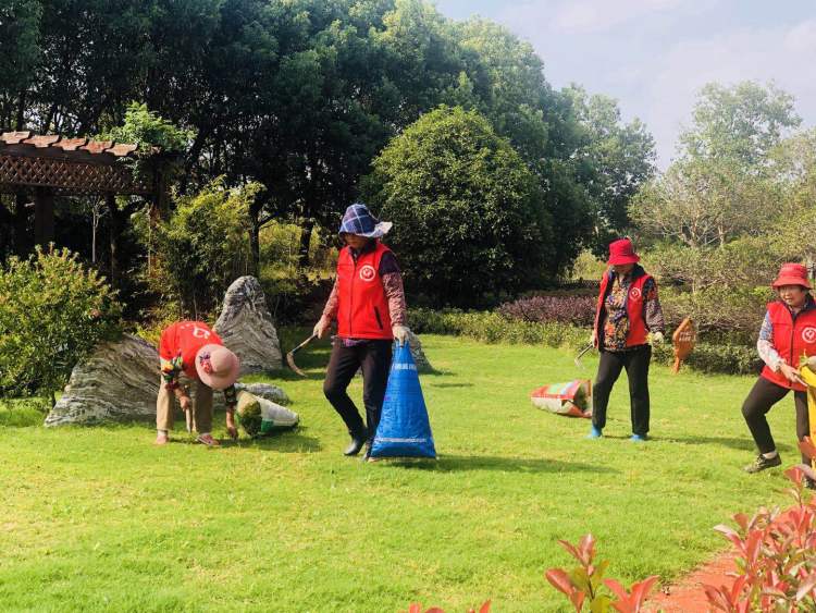 每天早上,在迎龙村范围内的草坪上,都会出现一群身穿红色工作衣的村民们,他们锄草、捡垃圾、养护……样样在行!“每天来搞一下绿化养护,就有100块钱呢!”村民阿婆们通过劳动,在家门口就实现了增收,个个干得起劲,张阿婆说,“我们早上干活,下午就来散散步,享受一下美好的环境!还有工资赚,开心哦!”