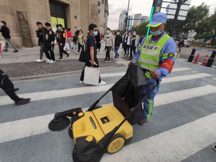 欣谊公司工作人员介绍,包括东拓段在内,整个步行街推行精细化保洁,白天以机械保洁为主,让市民游客看不到扫帚等传统的保洁工具,“清晨五点多,环卫工人上岗之后会用扫帚普扫,白天以机械化保洁为主,同时保洁员身上佩有镊子、抹布等小件保洁工具,对地面缝隙、座椅等进行擦拭保洁”。