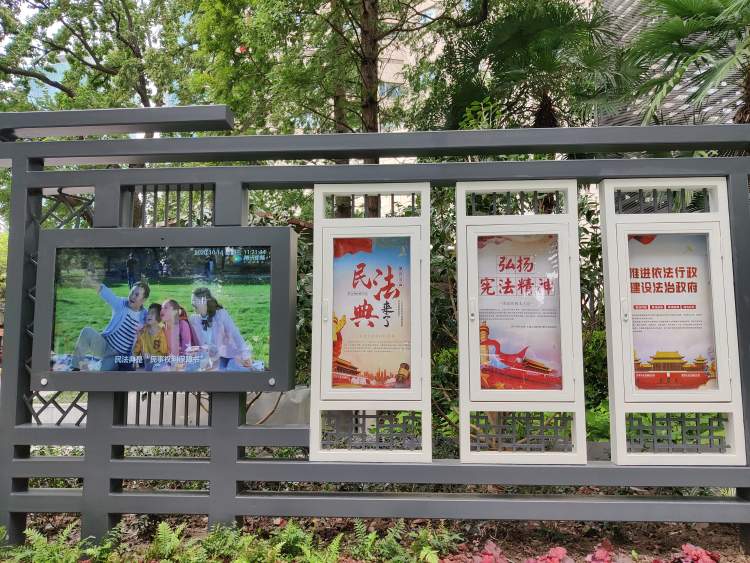 绿地一角设置了法治宣传栏,定时会向市民进行普法宣传。未来,相关部门还将在这里举行现场普法宣传活动。