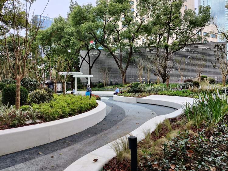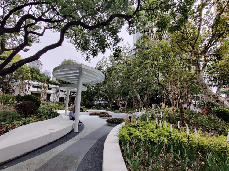 纯白叶片廊架、“高级灰”花园步道、混凝土极简座椅……近期,静安区威海路延安中路口的公共绿地华丽变身为“北欧风”街心花园,并于日前正式向市民开放。