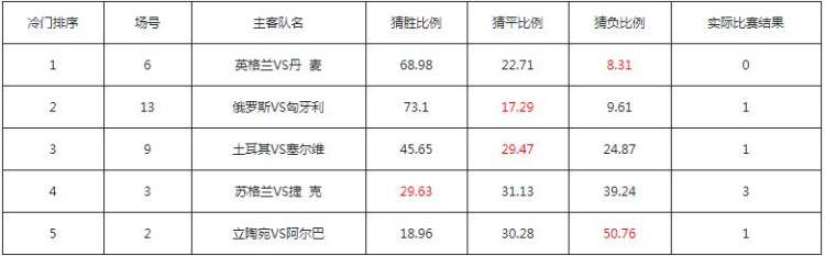 体彩中心公布的冷门排行榜显示,英格兰主场0比1不敌丹麦,成为本期第一大冷门,猜负的比例仅为8.31%,猜胜比例为68.98%。俄罗斯0比0战平匈牙利,位列冷门排行榜第二名,猜平比例为17.29%,猜胜为73.1%。土耳其2比2战平塞尔维亚列冷门排序第三,猜平比例29.47%,猜胜比例45.65%。苏格兰1比0击败捷克成为本期第四冷门,猜胜比例29.63%。