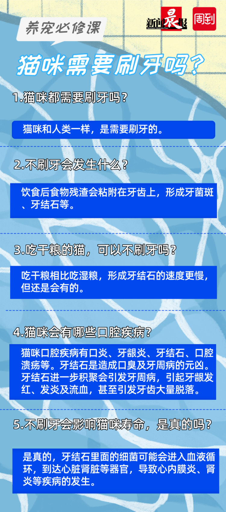很少有人给猫咪刷牙。倍珍保的宠物医生曲燕燕告诉周到君,在上门问诊的宠物家长中,给宠物刷牙的可能10%也不到。