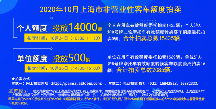 上海国拍公司今天发布,10月份车牌拍卖将于10月24日(10:30-11:30)举行,本月个人额度投放14000辆,个人在用车有效额度委托拍卖1435辆,合计拍卖总数15435辆,与上月基本持平。警示价为89300元,拍卖系统网址:https://paimai.alltobid.com